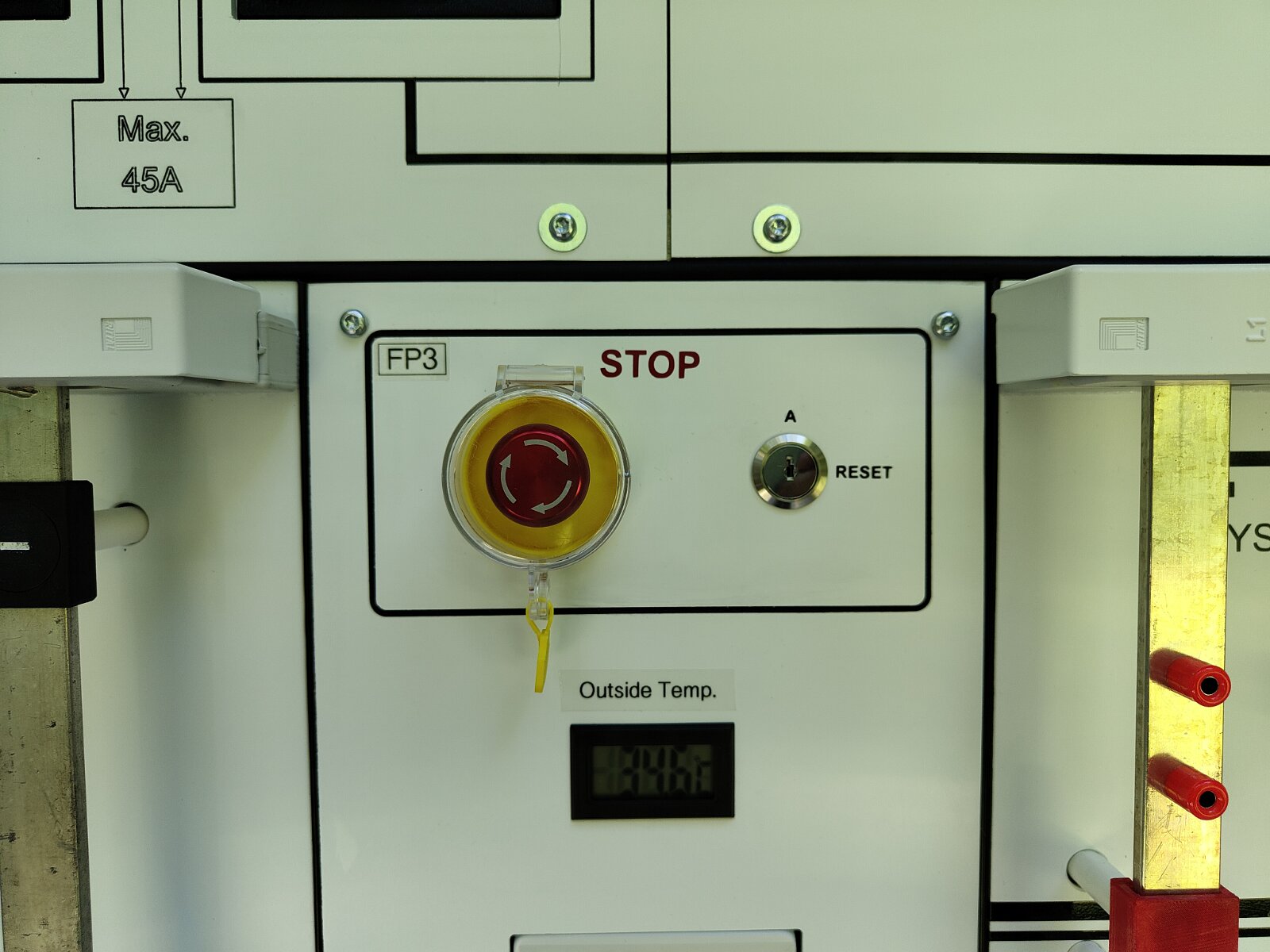 Ein zentrales Element für den sicheren Betrieb ist der Not-Aus-Schalter. Mit ihm kann im Ernstfall die Stromversorgung von den Batterien zu den Ladebuchsen unterbrochen werden, beispielsweise bei einem Brand im Geräteschuppen oder bei einem überhitzten Akku, wenn das Ladegerät nicht mehr regulär ausgeschaltet werden kann. Nach einer Notabschaltung ist ein geordneter Reset erforderlich, der nur von eingewiesenen Personen mit Zugang zu den Schaltern im Geräteschuppen durchgeführt werden darf.